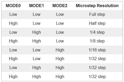 Il se configure en positionnant des jumpers sur MO, M1, M2. Le choix de configuration dépend du niveau de microstepping souhaité, par exemple avec un driver DRV8825 peut aller jusqu’à 1/32.